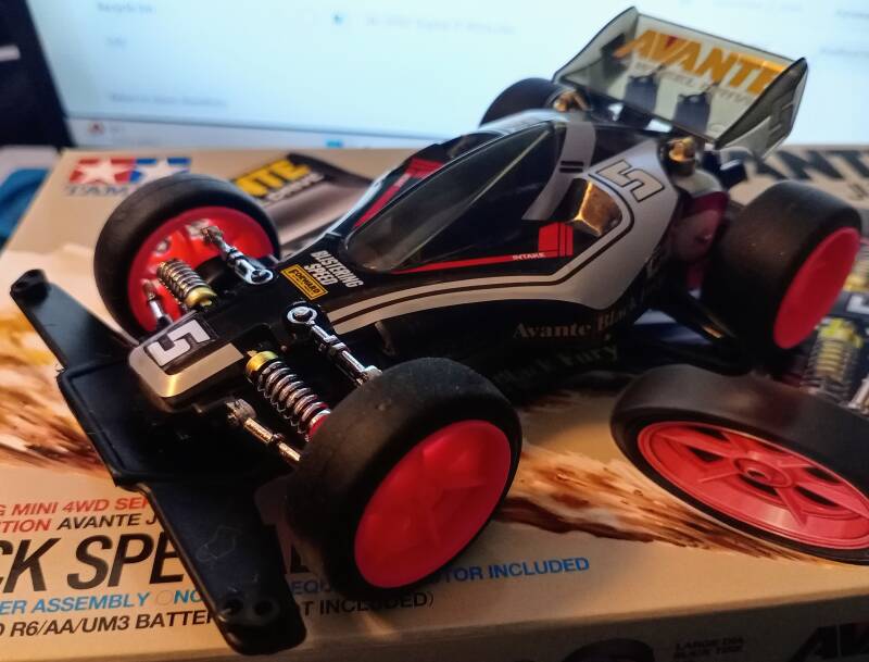 This car is a model of the popular 'Aero Avante'. The base body colour is blue as are some of the accessories provided such as the spinners, with a standard black chassis.